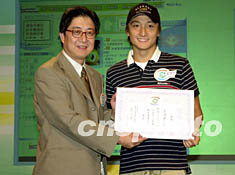 歌星方力申9月5日出席香港電臺聯同教育署舉行「教育電視2002-2003新學年啟播典禮」。助理廣播處長張文新向方力申致送邀請狀,邀請他參與演出教育電視節目。鄧慶樂 攝