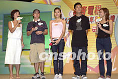 四位樂壇年青歌手方力申、李彩樺、余文樂、方皓玟(左二起)9月5日出席香港電臺聯同教育署舉行的「教育電視2002-2003新學年啟播典禮」。他們將有機會參與演出教育電視節目,教育電視節目將于9月9日起正式啟播。鄧慶樂 攝