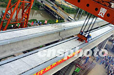 五日,隨著第2550根預應力混凝土軌道梁穩穩地架設在磁懸浮工程的蓋梁上,上海磁懸浮工程實現了軌道梁全線貫通。圖為第2550根軌道梁架設成功。湯彥俊 攝