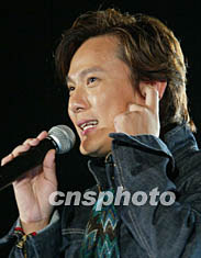 臺灣歌手張信哲十日晚在遼寧丹東市為2002年中國鴨綠江國際旅游節演唱助興。作者:趙振清