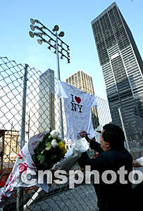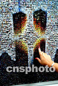 由“9.11”事件遇難者照片組成的雙塔紀念畫,9月10日(美國紐約時間)被張貼在紐約世貿中心遺址前的百老匯大街上。作者:王瑤