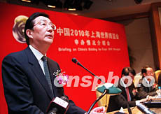 十二日晚,中國2010年上海世界博覽會申辦情況介紹會在北京舉行,上海市市長陳良宇稱對成功申辦2010年世博會信心十足。作者:盛佳鵬