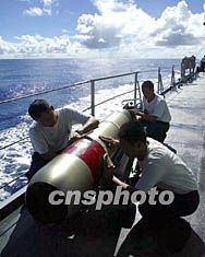 中國海軍環球航行訪問艦艇編隊九月二十日已滿載各國人民和軍隊的友誼,返航到祖國領海,經各系統全面檢查、檢驗證實,艦艇機械、武器裝備和艦容均處于良好狀態。圖為水兵對水中兵器進行檢測保養。王松岐 攝