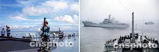左圖:登陸兵在艦上進(jìn)行防空演練。 右圖:艦艇編隊(duì)在航行中演練。