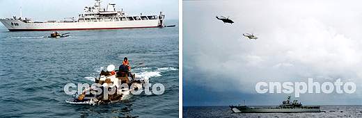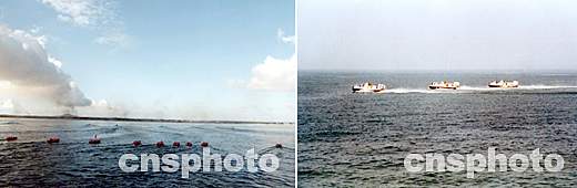 左圖:新型氣墊船沖擊上陸。 右圖:艦艇在海上進(jìn)行隊(duì)形變化。