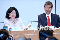 香港保安局局長葉劉淑儀(左)、署理保安局常任秘書長湯顯明,9月24日在政府總部公布有關《基本法》第二十三條的諮詢文件。洪少葵 攝
