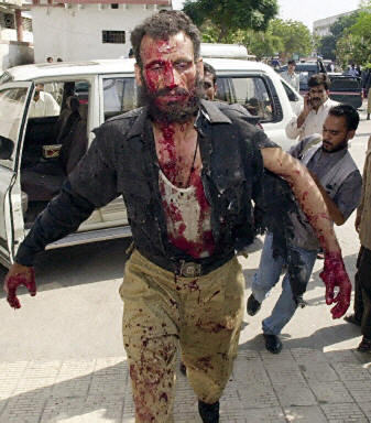 巴基斯坦警方16日說,巴南部城市卡拉奇的警察局和其它政府機關的多個辦公室當天接連發生郵包炸彈爆炸案,雖未造成人員死亡,但至少有9人受傷。圖為被郵包炸彈炸傷的警察。