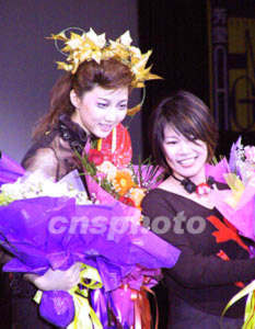 二00二廣東(秋季)時裝周,十九日晚在廣州花園酒店降下帷幕,獲獎設計師與模特接受現場觀眾祝賀。作者:劉衛勇