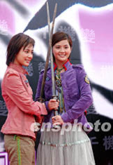 香港英皇集團旗下當紅明星Twins, 10月21日在啟德舊機場《千機變》電影記者會上手持除妖斬魔劍為新片作造型。洪少葵 攝