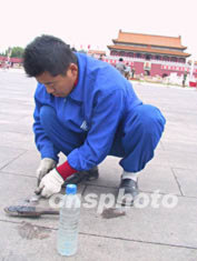近日來,邊清理邊增加的天安門廣場口香糖污染問題引起媒體關注。短短幾天時間內,廣場上就產生了60多萬塊口香糖垃圾。有的地方不到一平方米的地面竟然有9塊口香糖污漬。神圣和莊嚴的天安門廣場竟布滿密密麻麻的口香糖斑痕。