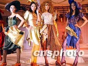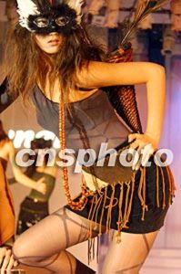 2002年中國義烏國際小商品博覽會二十三日在浙江義烏市舉行,中外客商云集,精品薈萃。中國著名襪業品牌“夢娜”有限公司在博覽會上推出中國首場腿部時裝秀,圖為戴面具的模特展示精美襪裝。作者:錢興強