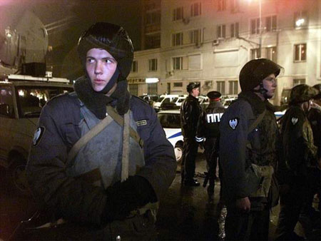 俄羅斯警方在發生劫持人質事件的劇院外高度戒備。(春風)