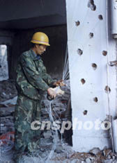 三峽導(dǎo)流明渠截流在即 ,爆破人員在重慶奉節(jié)舊縣城,給要拆除的房子裝彈藥,準備進行一次性爆破拆除。作者:李中全