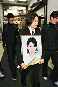 中新網(wǎng)10月24日電 于本月初在家中意外死亡的葉世榮未婚妻許韻珊,昨日在世界殯儀館設(shè)靈,今日出殯,其遺體將葬于將軍澳華人永遠(yuǎn)墳場(chǎng)。昨日靈堂門外寫著“葉府治喪”,世榮送給Cynthia的花圈亦以“愛妻”為名,他更細(xì)心地為Cynthia戴上結(jié)婚戒指,以“丈夫”身份送“愛妻”最后一程。