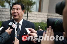 出席中共十六大的中央企業系統代表鄭斯林接受記者訪問。