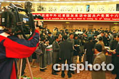 中國共產(chǎn)黨第十六次全國代表大會新聞中心六日晚在北京梅地亞中心舉行酒會,歡迎前來采訪的中外記者。毛建軍 攝