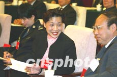 來自北京公交系統的十六大代表李素麗,在北京代表團分組會上與代表一起討論十六大報告。著名勞動模范李素麗曾是巴士車上的一名普通售票員,現在主持“公交李素麗服務熱線”工作。作者:毛建軍