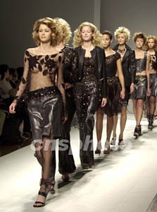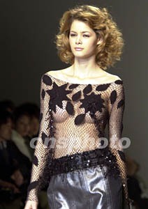 十一日正在東京舉行的二00三年春夏時裝展上,黑色透視裝分外迷人。作者:陶光雄