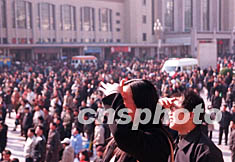 十一月十五日,新一屆中共中央政治局常委通過電視直播與民眾見面,北京火車站廣場的大屏幕前站滿了觀看直播的市民。作者:張宇
