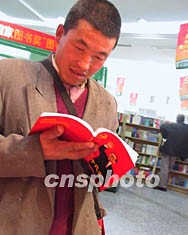 一位來京農民十五日在北京圖書大廈閱讀介紹江澤民的文章。中共新一屆領導人今日公布,上一屆領導人仍受到人們關注。作者:王麗南