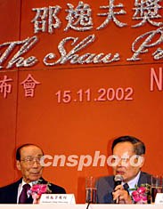 每項獎金為一百萬美元的“邵逸夫獎”十一月十五日在香港設立,該獎目前有天文學、數學科學、生命科學三個獎項,每年頒發一次,預計二零零四年年中舉行首屆頒獎。圖為該獎評審會主席楊振寧(右)與邵逸夫出席香港“邵逸夫獎新聞發布會”。潘索菲 攝