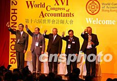 十一月十八日,香港舉行規模盛大的世界會計師大會歡迎酒會,圖為香港特別行政區行政長官董建華(中)出席該酒會。潘索菲 攝