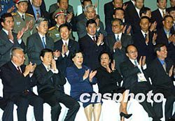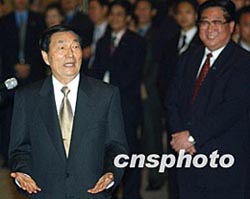 中國(guó)國(guó)務(wù)院總理朱镕基和夫人勞安,11月19日下午在香港會(huì)見(jiàn)中資機(jī)構(gòu)的諸位“老板”,香港特首董建華和夫人陪同會(huì)見(jiàn)。中新社傳真任晨鳴攝