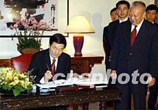 十一月十九日,香港特區政府在禮賓府設宴歡迎國務院總理朱镕基,朱總理在禮賓府題字留念。中新社傳真潘索菲攝