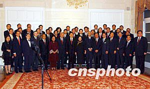 十一月十九日,香港特區政府在禮賓府設宴歡迎國務院總理朱镕基一行,朱镕基與賓客合影。中新社傳真潘索菲攝
