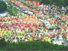 下午1時(shí),已有超過(guò)6萬(wàn)人的游行人數(shù)將中正紀(jì)念堂大門(mén)口擠得水泄不通,而且包括愛(ài)國(guó)東路與信義路上的側(cè)門(mén),也滿是穿著綠色背心的農(nóng)漁民,不斷揮舞著“支持改革,反對(duì)消滅”的標(biāo)語(yǔ)旗幟,不少鄉(xiāng)鎮(zhèn)的農(nóng)漁民更帶著大鼓、大鑼敲打助勢(shì),讓人感受到農(nóng)漁民總動(dòng)員的龐大氣勢(shì)。