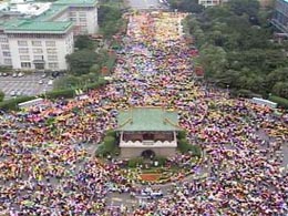 雖然有些縣市人數(shù)減少,但因地緣關(guān)系,北縣人數(shù)反而增加,從近午開(kāi)始,中正紀(jì)念堂就開(kāi)始人滿為患,從高處俯瞰,只見(jiàn)到黑壓壓一片,十分驚人。而國(guó)民黨主席連戰(zhàn)也在午后1時(shí),抵達(dá)現(xiàn)場(chǎng)向農(nóng)漁民“致意”。