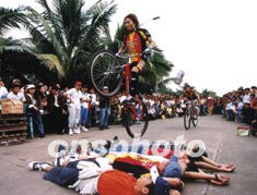 第三屆中國海南島歡樂節開幕式日前在海口隆重舉行,來自島內外的中外游人近8萬參加了游園與聯歡。圖為飛車表演。作者:蔣聚榮