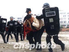中新社成都十一月二十六日電(記者楊杰)二十多名鬧事者企圖沖擊A國(guó)駐蓉辦事處,事態(tài)正在擴(kuò)大之中,消息瞬間即傳到屬地公安分局指揮室,一場(chǎng)恐怖與反恐怖的較量就此拉開帷幕。這是今天下午成都市反恐怖演習(xí)行動(dòng)開始時(shí)的情景。有關(guān)方面的官員到現(xiàn)場(chǎng)觀摩了整個(gè)演習(xí)行動(dòng)。