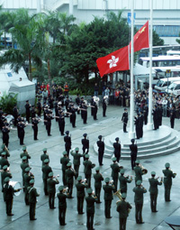 中新網12月1日電  聞名世界的北京天安門廣場升旗隊伍──中國武警軍樂團﹐今日首次與香港警隊樂團在香港的金紫荊廣場聯合舉行升旗儀式。