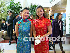 十二月三日,靚麗的中國申博形象大使袁鳴(左)和丁曉軍身著民族服裝出現在摩納哥國際展覽局會議場館內,引來很多關注的目光。作者:崔煜芳