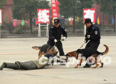 四日上午,湖南省公安系統舉行該省首次大規模多警種合成、模擬實戰反恐演習。圖為警犬搜捕演練中,巡邏民警和警犬聯合制服“歹徒”。作者:白祖偕