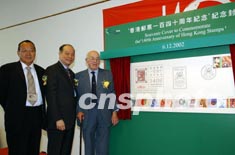 十二月六日,香港郵政發行紀念封,慶祝香港第一套郵票發行至今一百四十周年。左起為香港郵學會會長關卓然、香港郵政署長陸炳泉、香港郵學研究會(英國)會長卞耐特為巨型紀念封揭幕。中新社傳真 潘索菲 攝