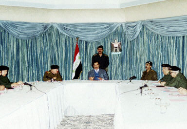 12月7日,伊拉克總統薩達姆(中)在巴格達主持內閣會議。薩達姆就伊拉克1990——1991年間占領科威特一事向科威特人民表示道歉的講話。這是薩達姆首次就入侵科威特表示道歉。