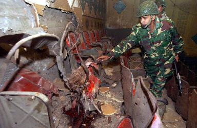 孟加拉國邁門辛市7日傍晚發(fā)生影院爆炸案后,8日又有4名傷者因搶救無效死亡,從而使死亡人數(shù)由14人上升到18人。7日傍晚,位于首都達(dá)卡以北127公里的邁門辛市4家影院先后發(fā)生炸彈爆炸,當(dāng)場炸死14人,100多人受傷。受傷者被立即送往醫(yī)院緊急搶救,其中不少人傷勢嚴(yán)重。圖為警察在檢查爆炸地點(diǎn)。