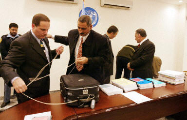 伊拉克政府7日向在伊拉克的聯合國武器核查小組負責人遞交了有關伊拉克大規模殺傷性武器研制情況的報告。這份報告將用聯合國專機運送到位于紐約的聯合國總部和位于維也納的國際原子能機構。圖為伊拉克官員捆綁遞交聯合國的武器核文件。