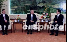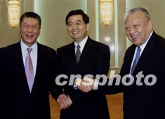 中國國家副主席胡錦濤十一日在北京會見來京述職的香港特別行政區行政長官董建華和澳門特別行政區行政長官何厚鏵。作者:鄭萍萍