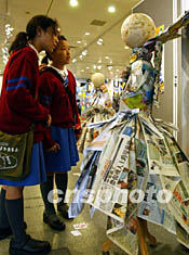 香港學童用舊報紙制作的時裝新近在中央圖書館展出,這種新穎的“環保時裝”吸引不少參觀者。潘索菲 攝
