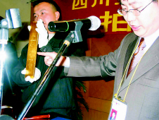 今天上午9點(diǎn),距離正式開(kāi)拍還有一個(gè)小時(shí),設(shè)在成都人和賓館會(huì)議室里的拍賣(mài)現(xiàn)場(chǎng)已是人聲鼎沸,從全國(guó)各地趕來(lái)的多家媒體紛紛搶占有利地形,而“競(jìng)拍席”上的買(mǎi)家則在最后時(shí)刻才神秘亮相。此前記者獲知,組織此次拍賣(mài)的四川金通拍賣(mài)行一直對(duì)參與競(jìng)拍的三家企業(yè)避而不談,只透露其中有著名電器銷(xiāo)售公司成都國(guó)美電器,而另兩家則是四川本省的企業(yè),但是在競(jìng)拍現(xiàn)場(chǎng)記者注意到,只有代表成都國(guó)美電器的28號(hào)競(jìng)買(mǎi)者比較活躍,而另外兩家企業(yè)的競(jìng)買(mǎi)人卻出人意料地沒(méi)有舉牌參加競(jìng)買(mǎi),結(jié)果,在開(kāi)場(chǎng)20分鐘后兩塊金錠就毫無(wú)懸念的以底價(jià)62萬(wàn)元被拍出。