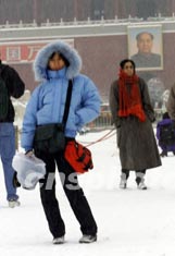 圖:少女全副裝備雪中游覽天安門廣場