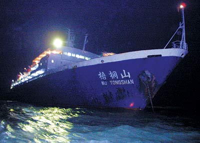 經過近40分鐘的航行后,記者終于看到漆黑海面上燈火通明的“梧桐山”輪。看上去,“梧桐山”輪船體已有些傾斜,但在夜幕中看不到火光和濃煙。