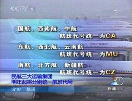 據中央電視臺報道,2003年1月1日起,重組后的國航、東航、南航三大民航運輸集團的航班代號將分別統一為CA、MU和CZ,同時西南航、中航、西北航、云南航、北方航、新疆航原有代號將不再使用。統一航班代號后,三大航空集團的飛機也將分別統一標志和名稱,常旅客計劃也將實現內部統一,擴展了常旅客會員累積里程和兌換獎勵的航班范圍。同時三大運輸集團還將分別統一航空餐食標準。為了保證航班運行正常和平穩過渡,三大集團近期不會對航班計劃和航線布局做大的調整。