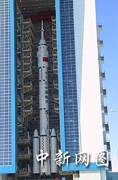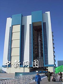 中國酒泉衛星發射中心總裝測試廠房中巍然聳立的“神舟”“神箭”組合體:“神舟”為中國載人航天工程進行第四次飛行試驗的飛船;“神箭”即中國運載火箭技術研究院研制的“長征二號F”運載火箭。中新社記者 孫自法 攝