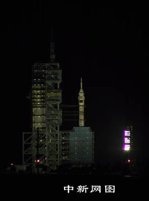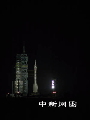 發(fā)射前十五分鐘,發(fā)射塔架旋轉平臺完全打開,“神箭”托舉著“神舟”蓄勢待發(fā)。 中新社記者 孫自法 攝