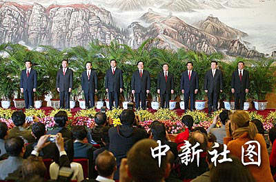 中國共產黨十六屆一中全會十五日上午在北京人民大會堂舉行,胡錦濤、吳邦國、溫家寶、賈慶林、曾慶紅、黃菊、吳官正、李長春、羅干等九人當選為新一屆中共中央政治局常委。作者:毛建軍