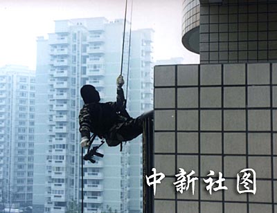 26日,成都首次反恐怖演習(xí)。在處置恐怖分子對(duì)某跨國公司辦公大樓實(shí)施的劫持人質(zhì)的演習(xí)中,特警秘密潛入大樓,準(zhǔn)備伺機(jī)行動(dòng)。作者:劉真